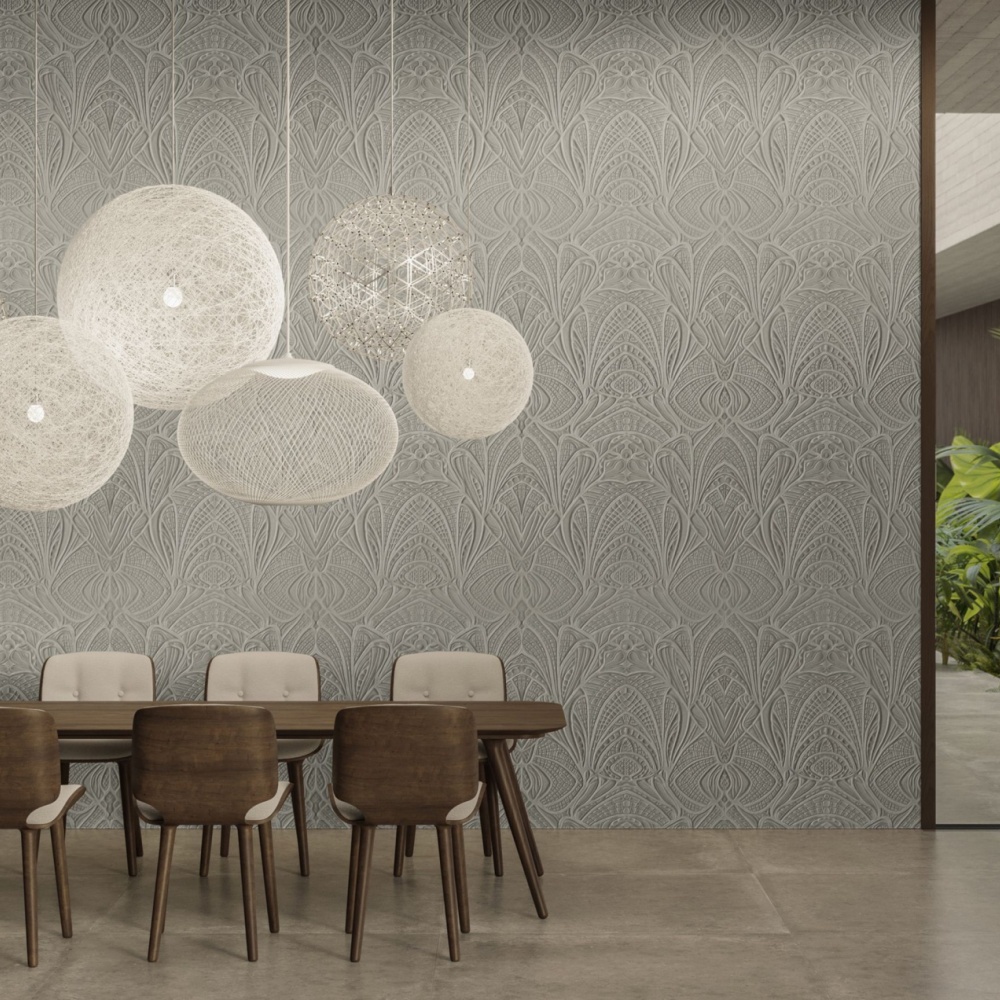 The Lacy Longlegs Wallcovering is a 3D textile wallcovering. This tactile wallcovering creates a soft, three-dimensional effect courtesy of the bouclé fabric. The design takes inspiration from the spider’s intricate weaves, preferred leaves and Gothic arches.